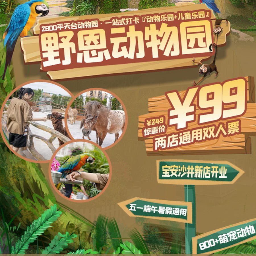 【宝安新店开业•2店联动】¥99双人畅玩野恩动物乐园,五一端午暑期通用!萌宠界&遛娃界的网红,50+种沉浸式场景、800+只萌宠动物,一站式打卡动物园+儿童乐园!