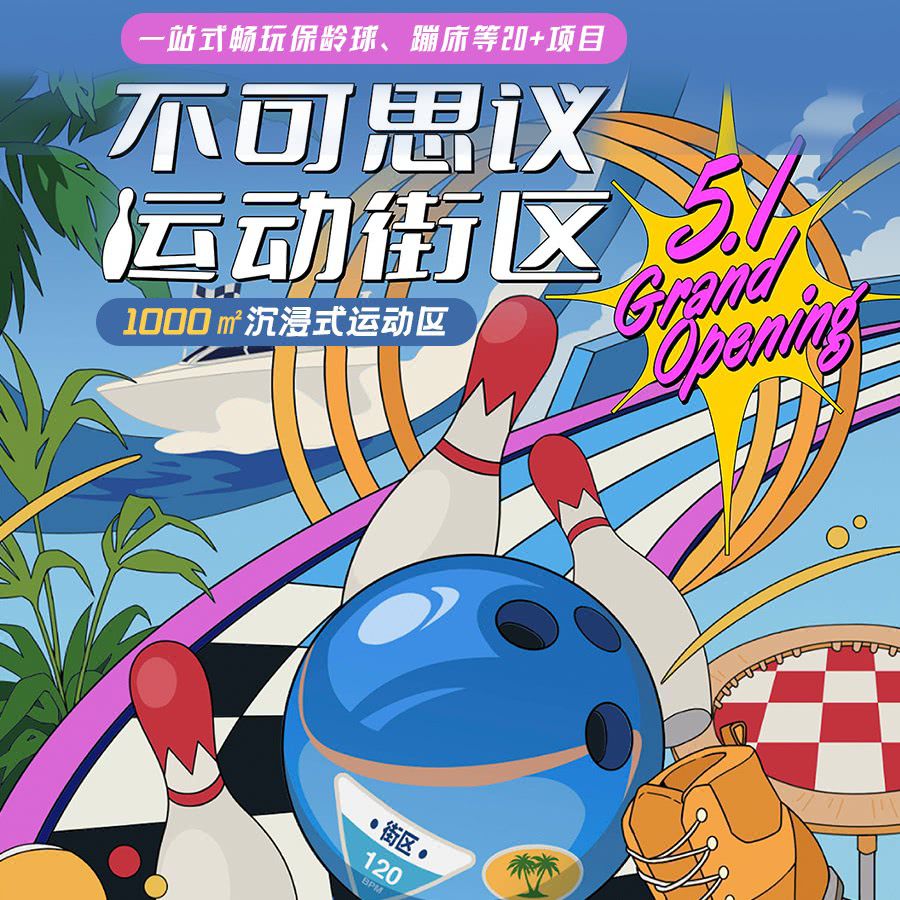 【五一开业】¥59.9起20+项目畅玩!1000㎡不可思议运动街区,保龄球、复古轮滑、蹦床...沉浸玩乐,减压减脂!就在海岸城购物中心~