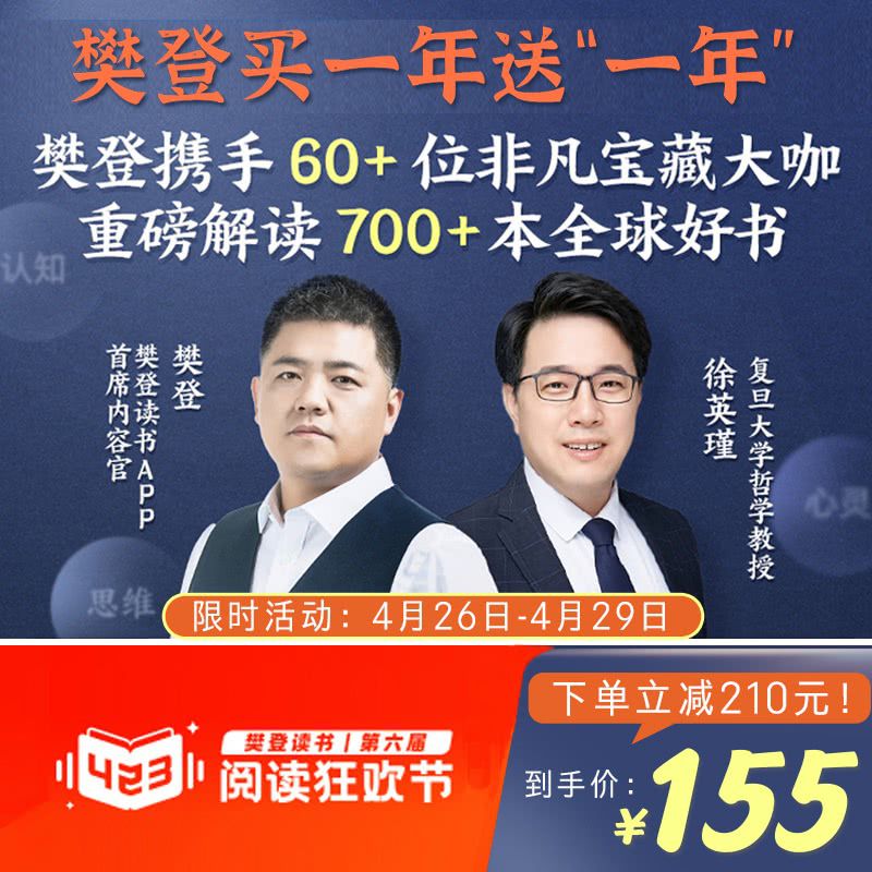 【4.26-4.29丨樊登买一年送“一年”】¥155享樊登讲书1年卡VIP+非凡精读1年卡VIP+樊登电子知识大礼包,汇聚全球700+本品质好书,大咖云集倾力解读,有深度、够专业