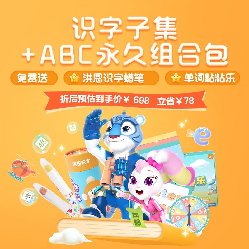 【洪恩双科优惠丨立省78元】洪恩识字永久包(含子集绘本永久包)+洪恩ABC永久包,包邮送洪恩识字蜡笔、单词粘粘乐,再赠电子故事专辑!