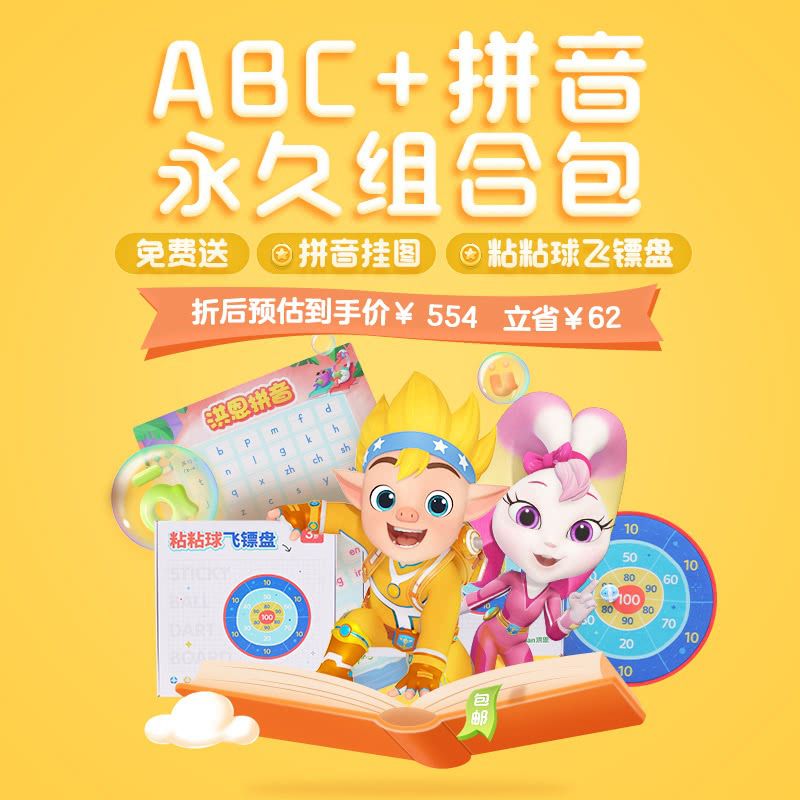 【洪恩双科优惠丨立省62元】洪恩拼音拼读永久包+洪恩ABC永久包,包邮送拼音挂图、粘粘球飞镖盘,再赠电子故事专辑!