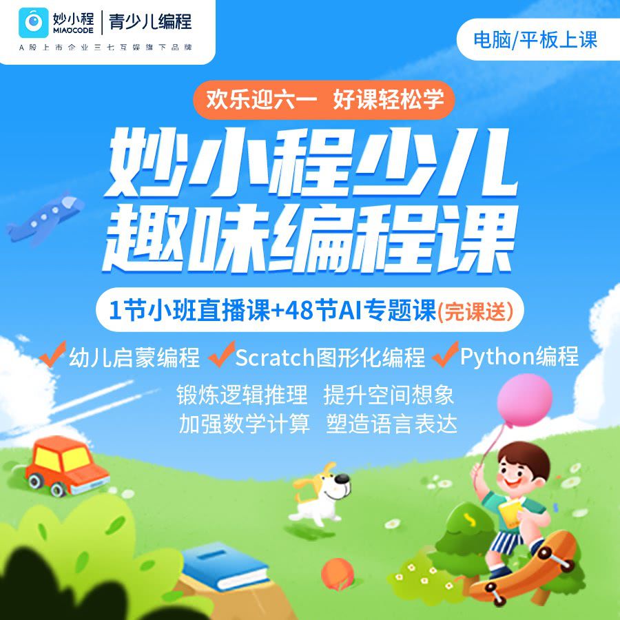 【欢乐迎六一 | 妙小程少儿趣味编程】真人小班直播课1节+启蒙AI课48节(完课赠),原创IP剧情动画,培养宝贝编程思维!
