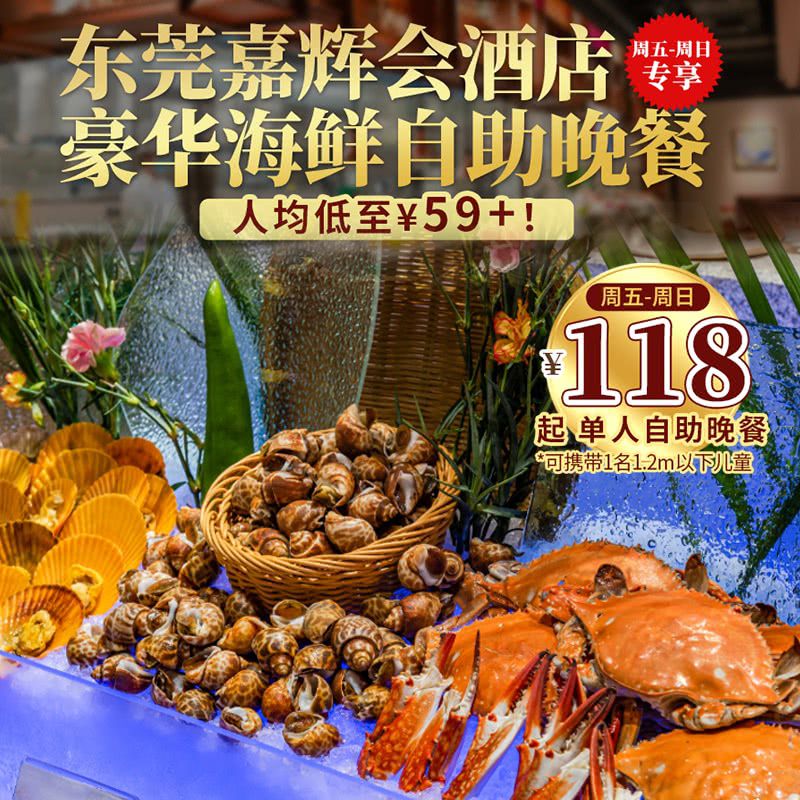人均低至¥59+!¥118/1大1小【东莞嘉辉会酒店】豪华海鲜自助晚餐,周五-周日专享!东南亚美食节,不限量吃遍异域美食!龙岗出发30分钟达~