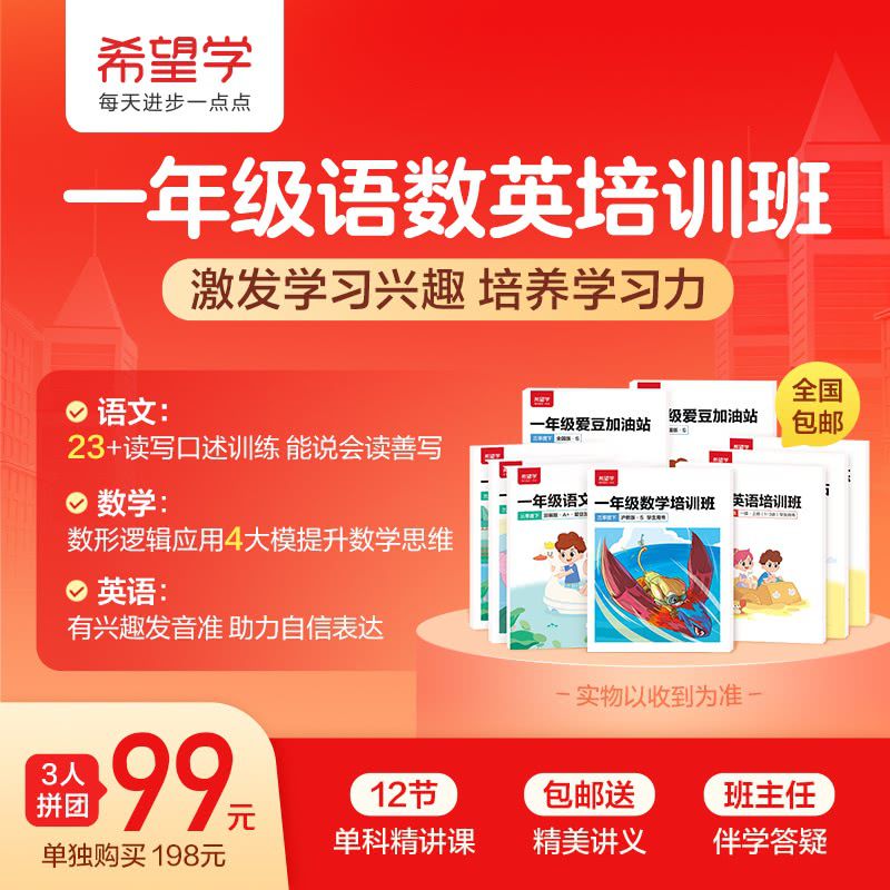 【包邮送超值教辅礼盒】仅限新一年级,99元=12节单科精选课+精美讲义练习册+班主任伴学答疑,希望学语数英培训班,语文能说会读善写,数学提升逻辑思维,英语助力自信表达!