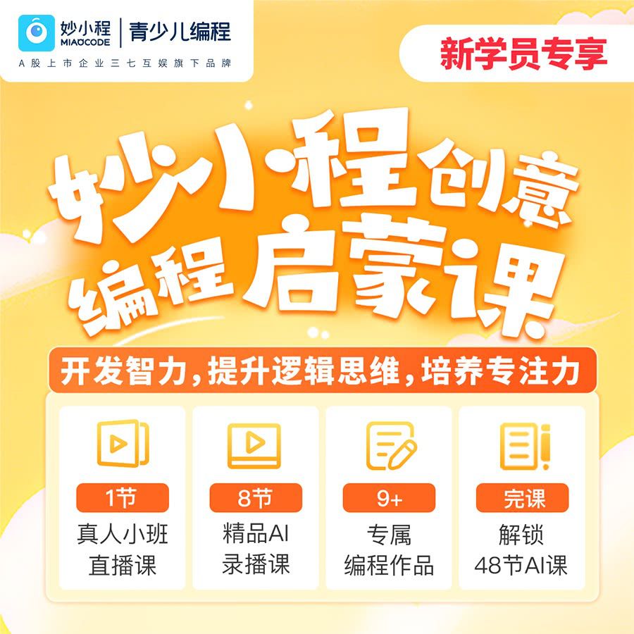【9.9元49节】学编程,开发大脑潜能!真人小班直播课1节+妙小程编程启蒙AI课8节,完课再解锁40节,原创IP剧情动画,培养编程思维