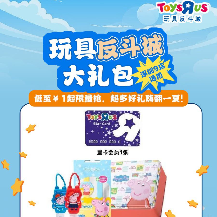 【深圳9店通用】低至¥1起限量抢「玩具反斗城」大礼包!到店1元换购小猪佩奇防护盒(限新客)!会员星卡+现金券+50/100元优惠券,超多好礼嗨翻一夏!