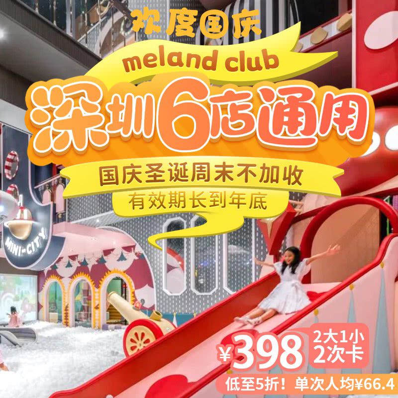 欢度国庆!低至¥66.4/人次!【meland club】深圳6店通用!¥398/2大1小2次卡,送2张¥50餐券!国庆圣诞周末不加收,有效期长至年底!沉浸式玩乐乌托邦,遛娃囤票趁现在~