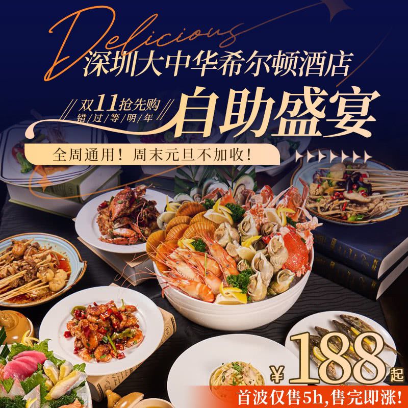 【深圳大中华希尔顿酒店自助·双11抢先购】¥188起/1大1小,仅售5h售完即涨!周末元旦不加收!晚餐金汤海参&清蒸大元贝派送、现煮龙趸/鲈鱼鱼汤!错过等明年~