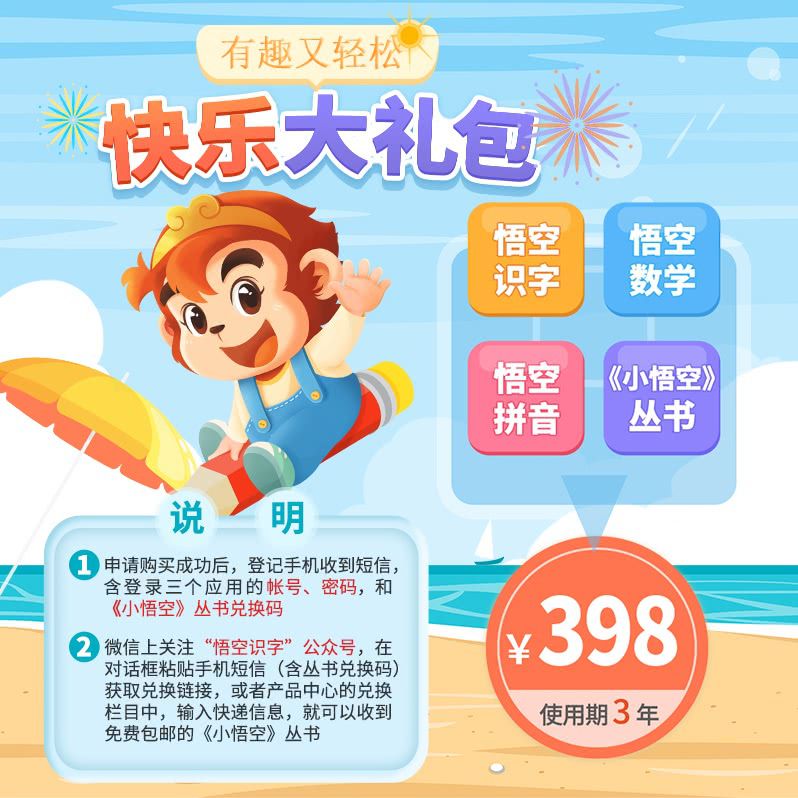 【悟空系列】快乐大礼包,398元学3年,悟空识字/拼音/数学,另包邮送《小悟空》丛书一本,结合儿童熟悉的《西游记》经典场景,每天只需10分钟,有趣又轻松!