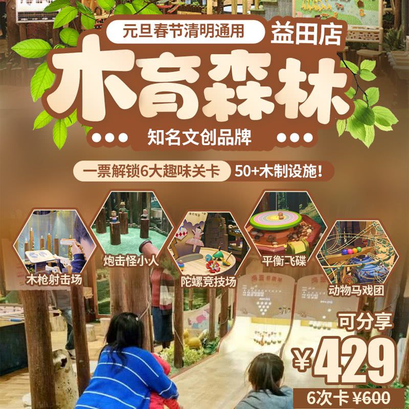元旦春节清明通用!【木育森林·益田店】年终福利!¥71.5/次,¥429抢6次卡(可分享)!风靡全国的“童话森林游乐园”,6大趣味关卡,50+木制设施~随时退安心囤!