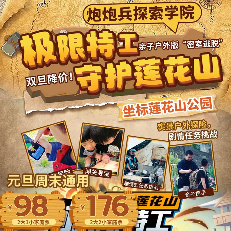 双旦降价!¥98/2大1小,元旦通用!【炮炮兵探索学院】极限特工守护莲花山,户外实景探险,剧情任务挑战,坐标莲花山公园~亲子户外版“密室逃脱”~