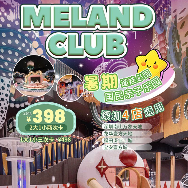 【MELAND CLUB暑期卡】深圳4店通用!人均¥66.4+,¥398/2大1小2次,¥498/1大1小3次,周末端午暑期通用!有效期到9月20日!遛娃必囤~