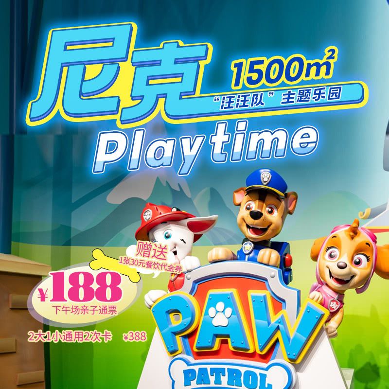 2层1500㎡汪汪队主题乐园!【尼克PLAYTIME】暑期大促人均¥65+,¥388/2大1小2次卡,周末端午暑期通用!另有¥188/1大1小下午场通票(送餐券),有效期到9月28日~