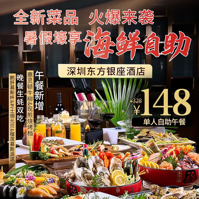 菜品全新升级!海鲜自助¥148起!【深圳东方银座酒店】午餐增惠灵顿牛柳&现煎烧烤档,晚餐生蚝双吃、鹅肝慕斯杯&芝士焗元贝&榴莲慕斯大派送!周末通用不加收~