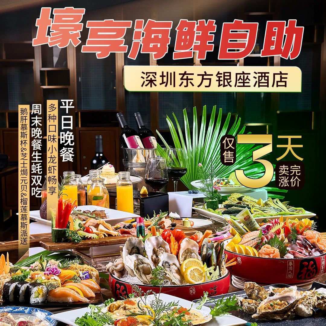【周末不补差】首波海鲜自助¥118起,仅售3天售完涨价!【深圳东方银座酒店】平日晚餐多种口味小龙虾畅享,周末晚餐鹅肝慕斯杯&芝士焗元贝&榴莲慕斯派送、生蚝双吃、香槟酒水自由!