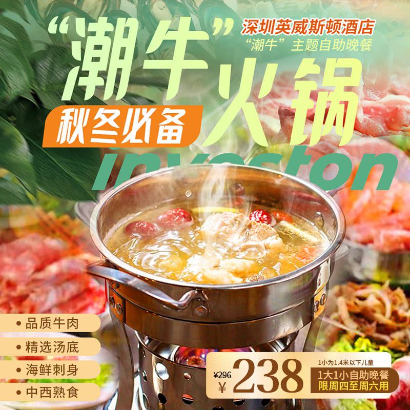 “潮牛”火锅上线!¥238/1大1小(1.4米以下),享「深圳英威斯顿酒店」自助晚餐,限周四至周六用!品质牛肉/精选汤底/海鲜刺身/中西熟食...丰富多样,满足味蕾!