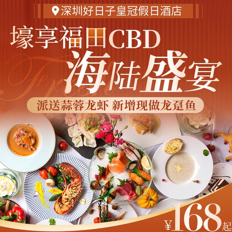 壕享福田CBD海陆盛宴!周末不加收!¥168起【深圳好日子皇冠假日酒店】海鲜自助晚餐,派送蒜蓉龙虾,新增现做过桥龙趸鱼&鲜果舒芙蕾!5条地铁可达,位置超优越!