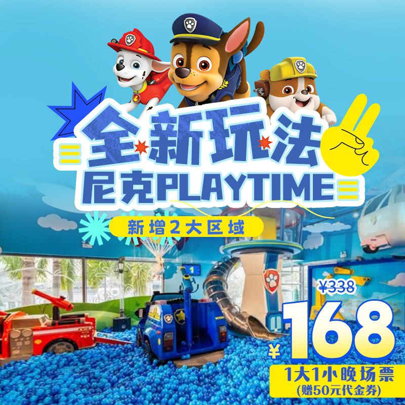 【新增2大区域】尼克PLAYTIME全新玩法,汪汪队冒险湾沙滩+海绵宝宝蹦床抓水母!¥168/1大1小晚场票(赠50元代金券)、¥188/2大1小全天票!随买随用无需预约!周末通用