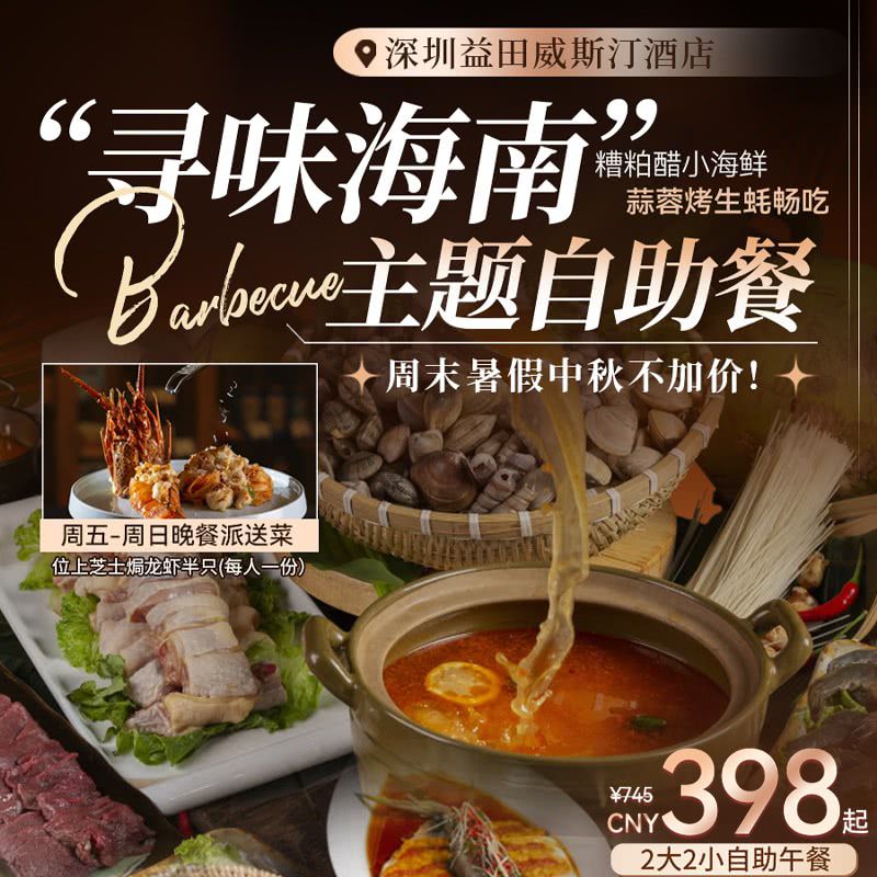 周末暑假中秋不加价!自助午餐¥398/2大2小(1.4+1.2米以下)!【深圳益田威斯汀酒店】“寻味海南”主题自助餐,糟粕醋小海鲜、蒜蓉烤生蚝&大虾畅吃!世界之窗地铁直达